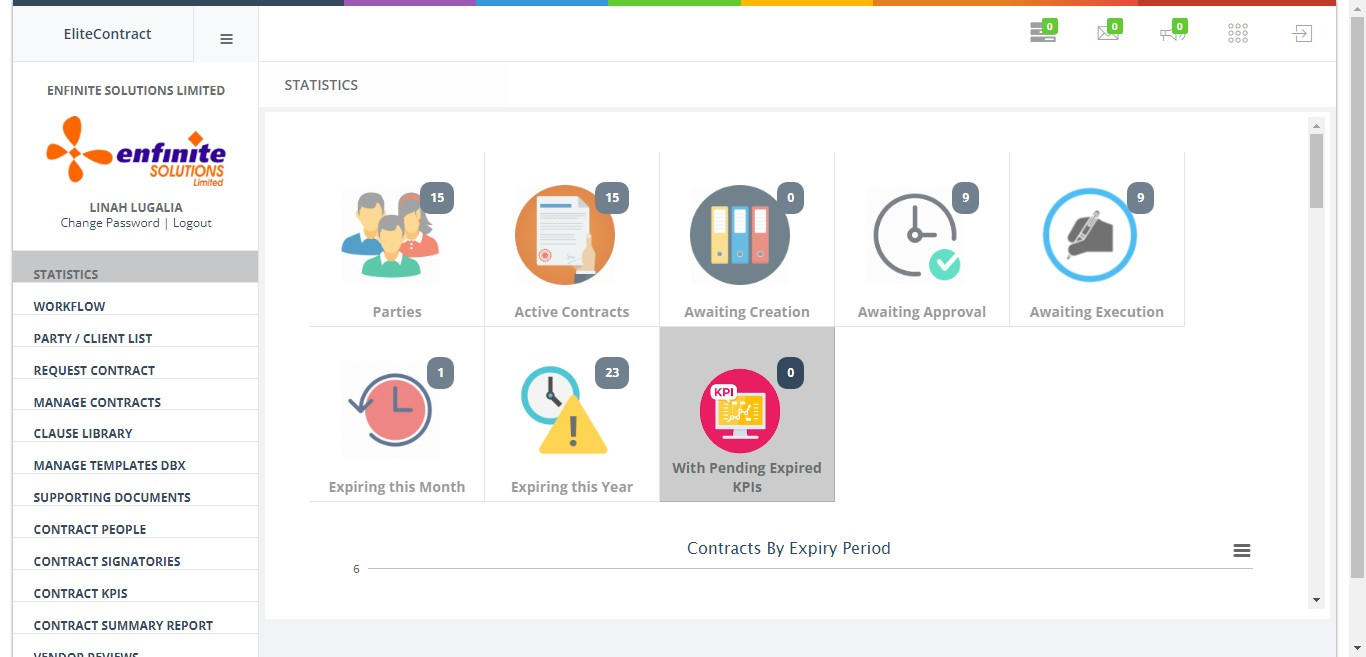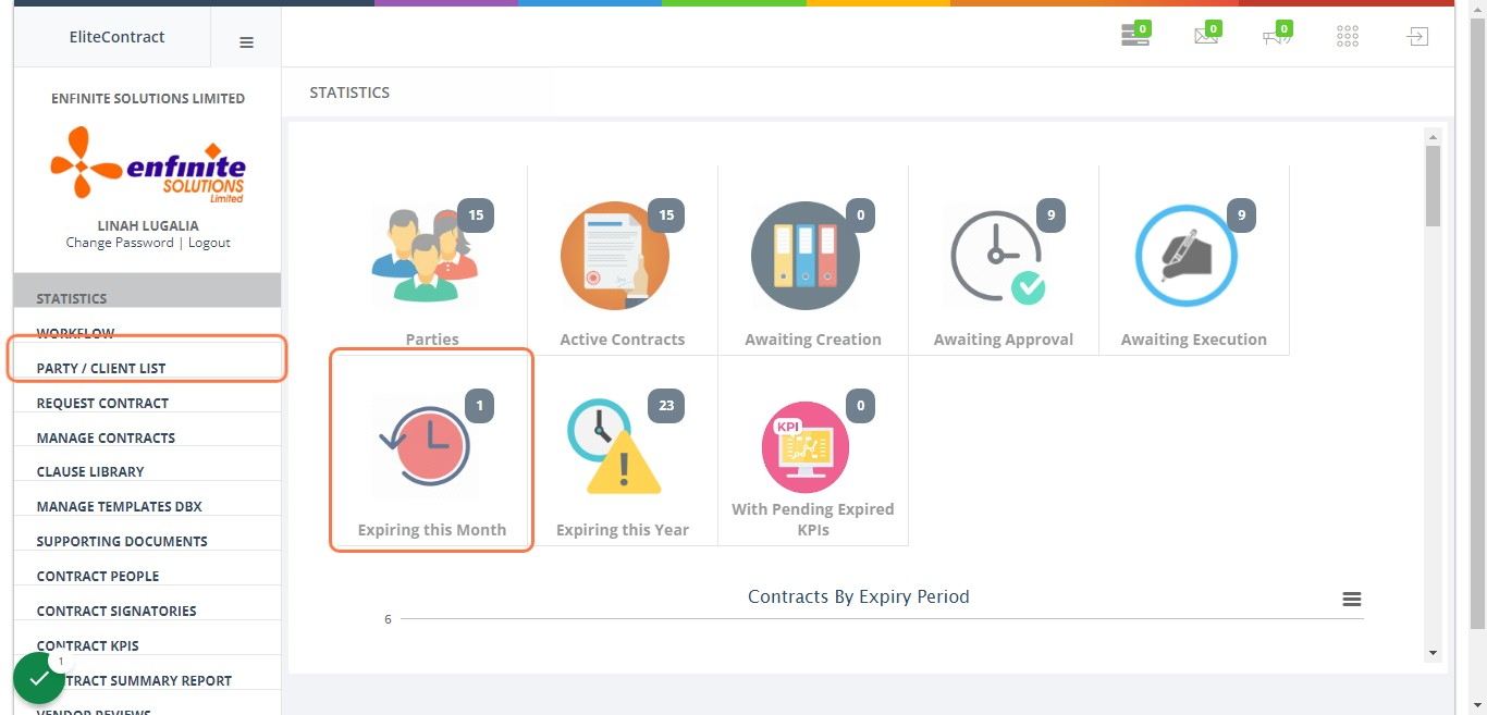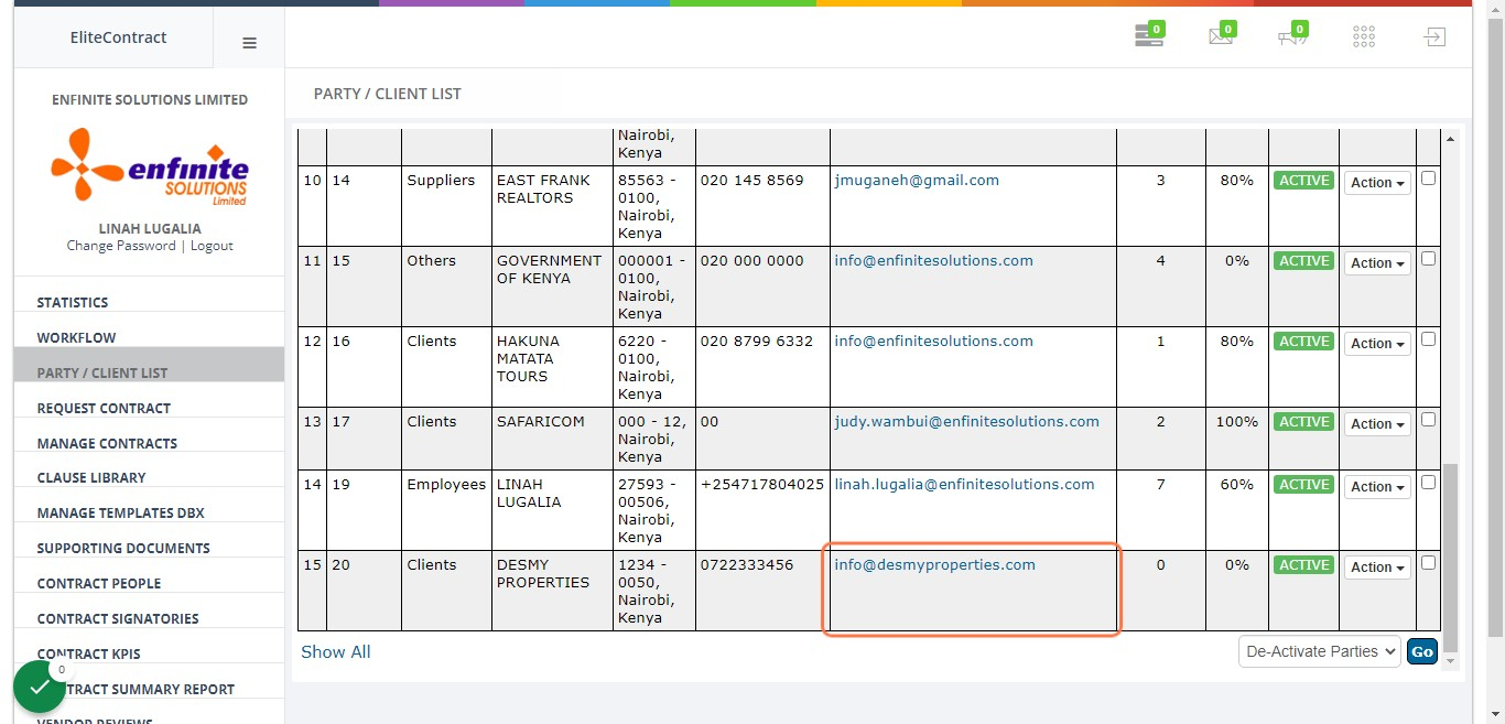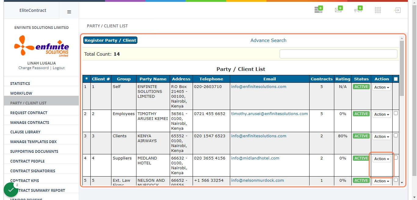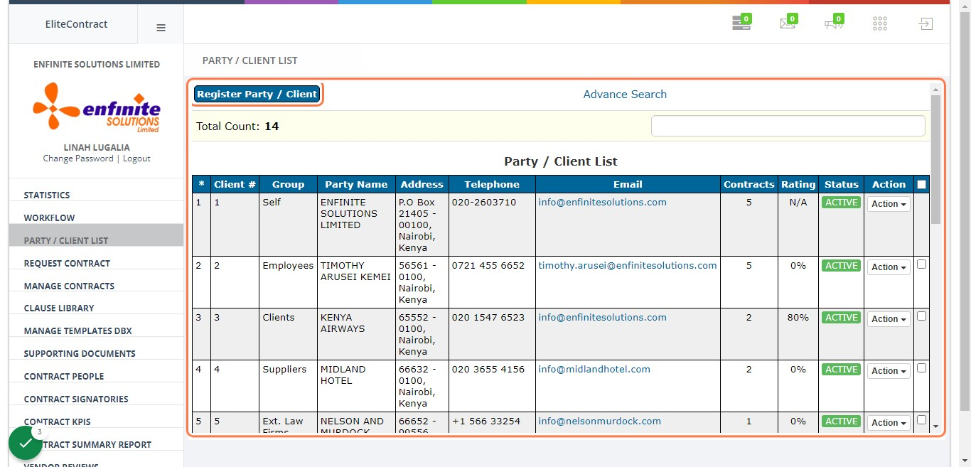 3. To view party/client list containing their details i.e. party name, address, email, number of contracts etc