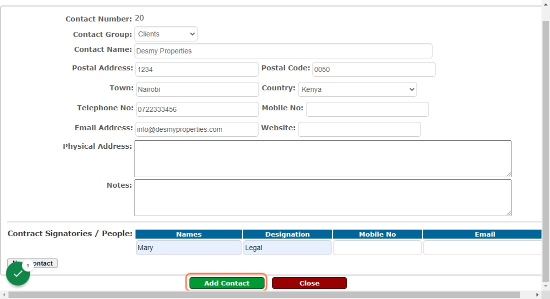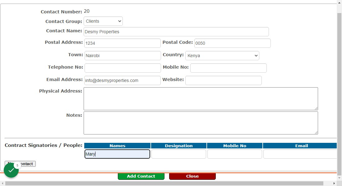 5. Fill in the details accordingly in the provided fields as shown below i.e. contact group (client, suppliers, employees etc), contract people etc