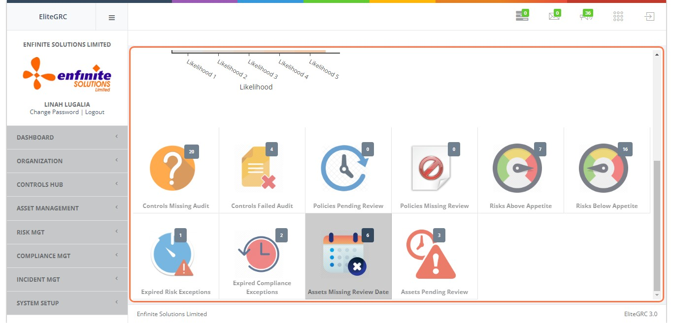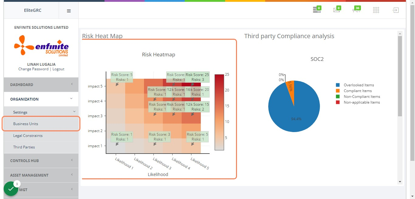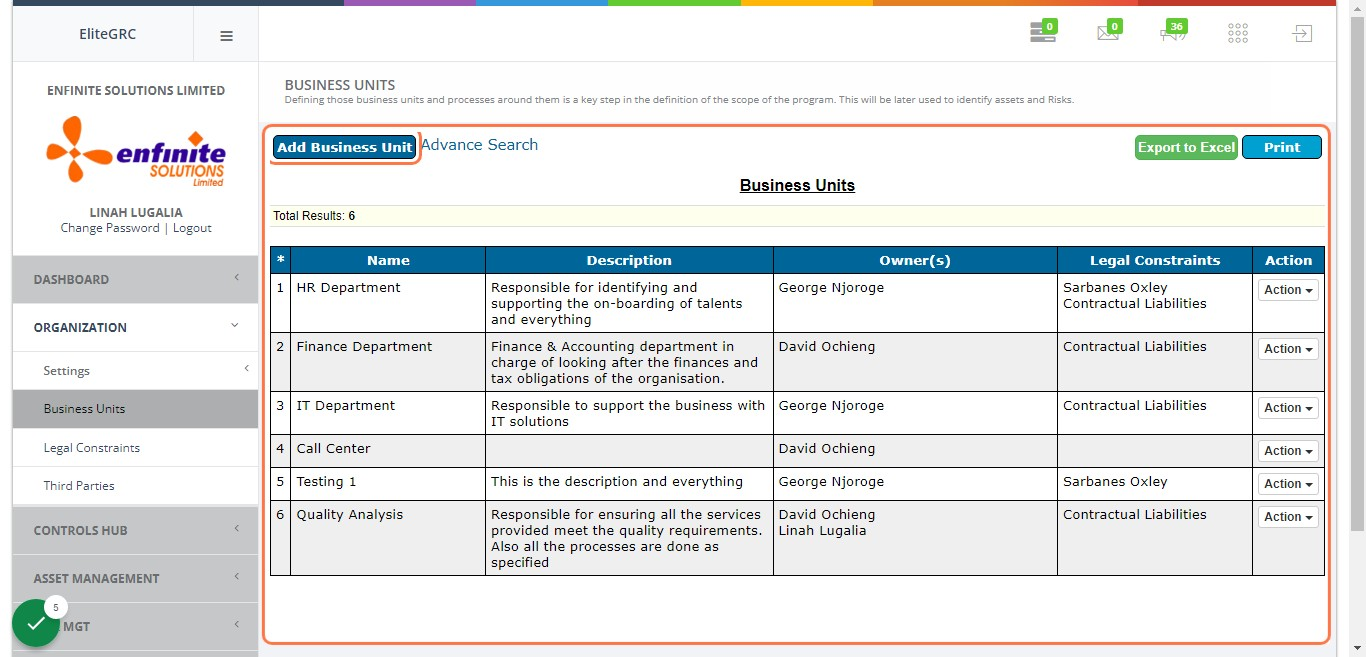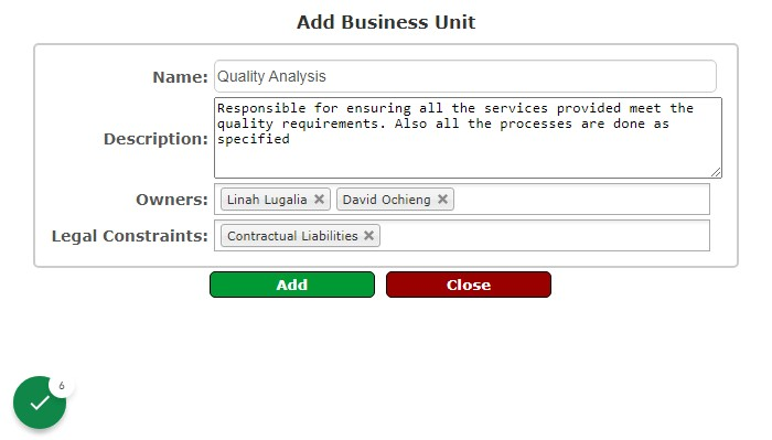 Business units are the different departments in the organizations. This module enables you to register them and the person in charge of a specific department and a description of the processes taking place around them which will be used later to identify assets and risks.